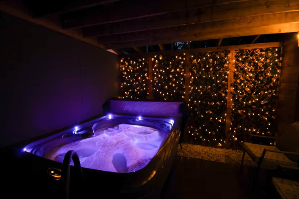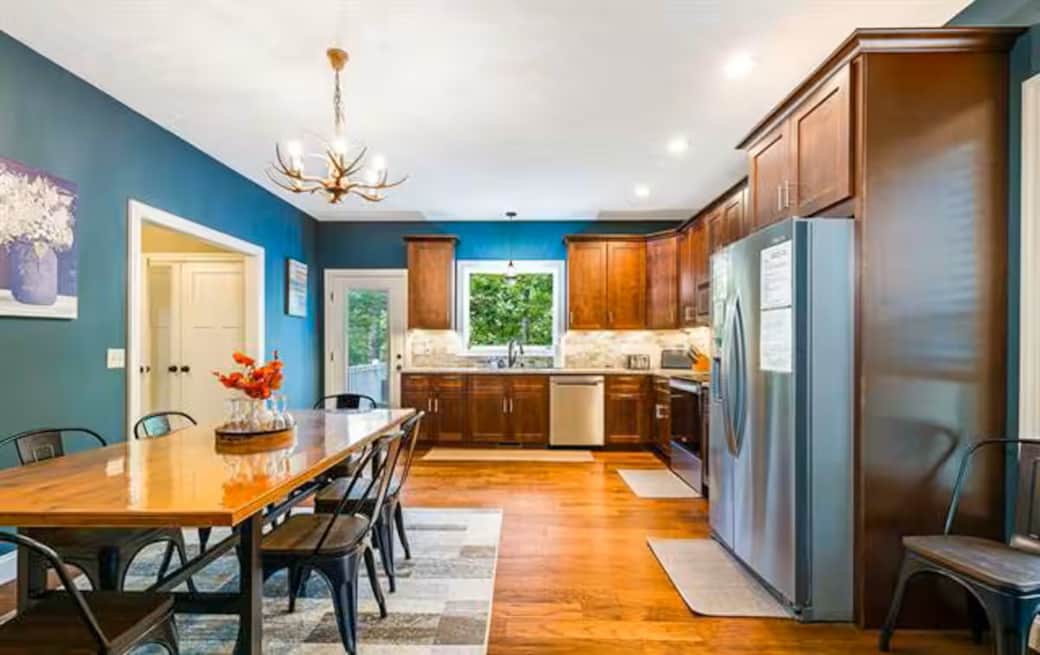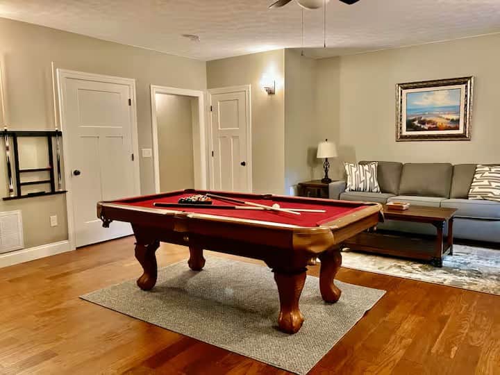 Family Room: Large screen TV, pool table, live edge bar, half bath, queen sofa bed and access to outdoor patio with hot tub and gas grill.